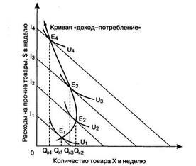 Точки С и D на кривой Энгеля соотносятся на кривой "доход-потребление" с точками Е3 и Е4 соответственно. Кривая Энгеля образуется посредством соединения всех точек, соответствующих различному доходу и связанному с ним равновесному количеству покупок благ X. Кривая Энгеля для нормального товара имеет положительный наклон, поскольку увеличение дохода всегда вызывает увеличение потребляемого объема такого блага.