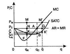 Теперь предположим, что все фирмы объединились в картель, оптимальным выпуском которого будет QM, а оптимальной ценой - Рм. Поскольку QM < Qc, каждой вошедшей в картель фирме будет определена квота выпуска продукции qk0< qc. При выпуске, равном установленной квоте, прибыль фирмы будет равна площади CkPMMF. Следовательно, ее прибыль, с одной стороны, сократится на KNAB, а с другой - увеличится на сумму площадей PCPMMN и CkCcKF. Поскольку сумма площадей PCPMMN и CkCcKF больше площади KNAB, фирма окажется заинтересованной во вхождении в картель.