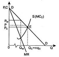 Когда две картелированные фирмы одинаковы по уровню и структуре издержек, рыночные доли могут быть распределены поровну (q1 = q22 = 0,5Q) при единой монопольной цене. В том случае, когда издержки фирм значительно разнятся, производственные квоты и соответственно рыночные доли будут различны и нестабильны. Тогда рыночные доли установятся в процессе торга, возникающего между олигополистами. И решение о размежевании рынка будет зависеть не только от уровня издержек входящих в картель фирм, но .и от их способности к выторговыванию квоты и доли рынка.