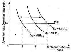 На рисунке используется изменение спроса на трудовые услуги. На рисунке показано, что, если увеличение спроса на трудовые услуги произойдет из-за увеличения цены продукта или из-за увеличения предельного продукта труда, то любой из этих факторов увеличит MRPL при любом данном уровне использования труда и сместит кривую спроса на труд от D1 до D2. И наоборот, понижение цены продукции или понижение предельного продукта труда сократит спрос фирмы на труд с D1 до D3