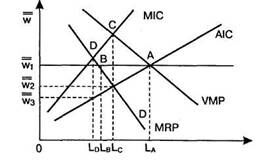 Фирма-монопсонист нанимает меньшее количество работников (Lc) в сравнении с точкой равновесия и на совершенно конкурентном рынке ресурсов (LA) выплачивает им более низкую заработную плату (w2 < < W1). На рынке ресурсов производства с совершенной конкуренцией точка равновесия устанавливается там, где доход от предельного продукта ресурса сравнивается с его ценой.