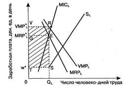 Монопсония достигает равновесия в точке Е, где MRPL = MICL. Чтобы нанять QL работников в день, фирма выплачивает дневную заработную плату в сумме w* денежных единиц в день. При этой зарплате фирма добавляет к своей прибыли сумму, равную площади VRST, которая может быть разделена на две части. Первую часть составляет площадь GEST, которая является приростом прибыли вследствие того, что в точке Е MRPL* > w*. Вторая часть - площадь GERV - прирост прибыли, ибо в точке Е VMPL* > MRPL*. Вся заштрихованная площадь VRST является добавкой к прибыли фирмы, так как она обладает властью и монопсонии, и монополии.