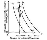 Допустим, что потребитель имеет 20 000 ден. ед. для распределения их расходования на два периода. Кривые безразличия показывают сочетания текущих и будущих расходов из данного объема текущего дохода, предпочтительность которых для потребителя одинакова.