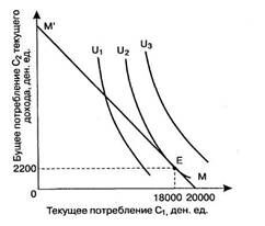Равновесие достигается в точке Е. В этой точке индивид потребляет 18 000 ден. ед. такущего дохода. Объем сбережения составляет 2000 ден. ед. в год, что обеспечивает потребителю в дополнение к сумме его дохода в следующем году дополнительное потребление на 2200 ден. ед.