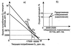 Чем круче кривые безразличия сберегающего, тем больше прибыль от ссудного процента, требующаяся для того, чтобы стимулировать потребителя к накоплению. Допускается, что предельная норма временного предпочтения всегда больше единицы во всех точках любой кривой безразличия. Потребитель с очень высоким временным предпочтением будет в равновесии в углу, соответствующем точке М. Этот потребитель не будет ничего из текущего дохода откладывать для накопления. Это означает, что для стимулирования потребителя к сбережению нужен положительный ссудный процент. Однако ставка ссудного процента не единственный фактор, оказывающий влияние на накопление. Последнее также зависит от доходов и предпочтений потребителей.