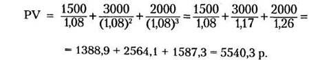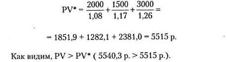 Если в приведенном выше примере доход фирмы распределится по годам следующим образом: 2000 р. в первый год, 1500 р. - во второй год и 3000 р. - в третий год, то в данном варианте дисконтированная стоимость станка будет равна: