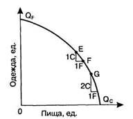 Предельная норма трансформации (MRT) - это тангенс угла наклона кривой производственных возможностей в каждой точке; она измеряет тот объем одного блага, от которого необходимо отказаться ради получения дополнительной единицы другого блага. Так, в точке Е на кривой MRT равна 1, так как, чтобы получить дополнительную единицу пищи, следует сократить производство одежды на 1 единицу. В точке G MRT равна 2, поскольку нужно пожертвовать 2 единицами одежды ради получения дополнительной единицы пищи.