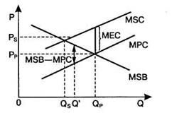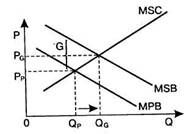 Когда правами собственника обладает получатель отрицательных внешних эффектов, плата источника внешнего эффекта за доведение объема производства, порождающего внешний эффект продукта вплоть до достижения общественно оптимального его количества Qg, будет выше в сравнении с предельными внешними издержками, ибо разница между предельной полезностью и индивидуальными предельными издержками производителей такого продукта MSB - МРС на всем промежутке от Q' до Qp больше МЕС, например для Q'