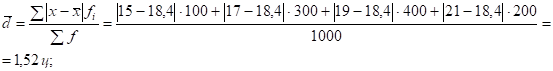 Стремление ослабить влияние случайных факторов приводит к расчету среднего линейного отклонения. Это отклонение определяется как средняя арифметическая из абсолютных значений отклонений индивидуальных значений признака от средней величины. Для сгруппированных данных расчет ведется по формуле:
