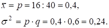 Применяя ранее рассмотренные формулы расчета можно определить среднюю и дисперсию альтернативного признака.