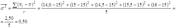 Приведем пример. Выборочное наблюдение урожайности зерновых культур по области проводилось при помощи отбора районов. По каждому отобранному району находилась средняя урожайность, которая оказалась следующей: I район – 14 ц с 1 га, II район – 15 ц с 1 га, III район – 14,5 ц с 1 га, IV район – 15,5 ц с 1 га, V район – 16 ц с 1 га. С вероятностью 0,997 оценить урожайность зерновых во всей области. В области 25 районов.
