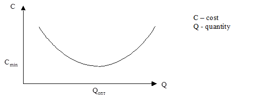 Оптимальный размер (оптимальная производственная мощность) фирмы в данной отрасли определяется объёмом выпуска Qопт, при котором производственная себестоимость продукции в долгосрочном периоде достигает минимума Cmin.