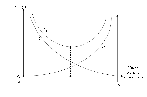 Здесь два крайних варианта организации экономики соответствуют «чистому рынку» и «чистому административному управлению», Сг - общие издержки на все трансакции, Су - общие затраты на административное управление, а CΣ= Сг + Су - суммарные затраты на трансакции и административное управление при наличии в экономике одновременно и того и другого. Как видно из рисунка, оба крайних варианта имеют непомерно большие для экономики издержки. В промежуточных состояниях экономики суммарные издержки CΣ уменьшаются. Точка минимума этих издержек определяет оптимальное сочетание рыночных трансакций и внутрифирменного административного управления, а следовательно, и оптимальные размеры фирмы. В этой точке предельные трансакционные издержки равны предельным издержкам на управление. Ранее было установлено, что оптимальные размеры фирмы определяются точкой минимума производственной себестоимости продукции, теперь выявлен факт зависимости оптимальных размеров фирмы также от величины управленческих издержек. С учётом обеих этих зависимостей можно констатировать, что оптимальные размеры фирмы достигаются тогда, когда полная себестоимость продукции, равная сумме производственной себестоимости и удельных управленческих издержек, достигает минимума.