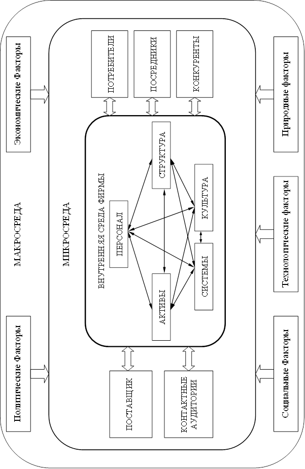 Внешняя среда фирмы - это система и факторы, которые находятся вне фирмы, прямо или косвенно взаимодействуют с ней и слабо или вообще не подконтрольны ей. Она, в свою очередь, состоит из двух принципиально различных частей: микросреды и макросреды.