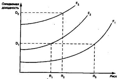 Кривые на карте предпочтений имеют положительный наклон, так как из сопоставляемых критериев один — позитивный, а другой — негативный. Изображенные на рисунке кривые носят название «кривых равных предпочтений» или «кривых безразличия», так как каждая из них отражает своими точками равнопредпочтимые для предпринимателя при данном уровне его удовлетворенности пары ожидаемой эффективности и рискованности решения.