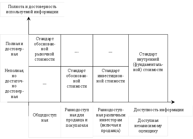Основные различия указанных стандартов (см рисунок 1) сводятся к различию в полноте и достоверности требуемой для оценки информации и ее доступности для разного круга участников рынка (достаточность информации здесь понимается как достаточность для применения того или иного метода оценки бизнеса).