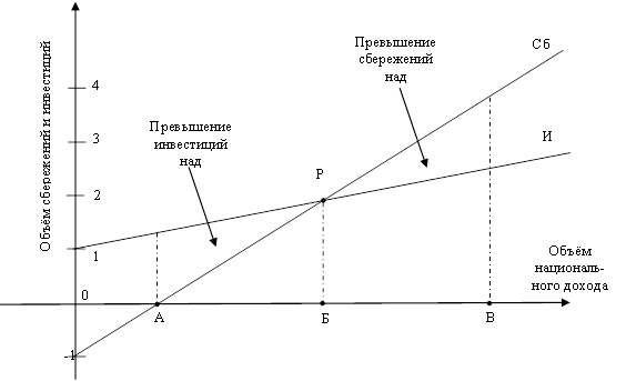 Рис.1.2 График формирования точки равновесия, объёмов сбережения и инвестирования капитала: И - кривая инвестиций, Сб - кривая сбережений; т. Р - точка равновесия между сбережениями и инвестиционными ресурсами. При этом она достигается при уровне национального дохода, который соответствует т. Б
