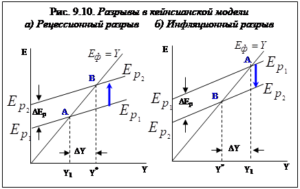 Если фактический равновесный ВВП меньше потенциального (Yфакт. < Y*), то в экономике имеет место так называемый рецессионный разрыв. Такая ситуация , в соответствии с кейнсианскими представлениями, обусловлена недостаточностью совокупных расходов для обеспечения уровня выпуска полной занятости, поэтому для достижения этого уровня выпуска (Y*) необходимо увеличить совокупные планируемые расходы Ep. (рис.9.10.(а)). Исходное равновесие находится в точке А, в которой величина совокупных планируемых расходов равна Е1, а объем равновесного фактического выпуска Y1, что он меньше, чем уровень выпуска полной занятости Y*. Чтобы обеспечить выпуск Y*, должны увеличиться планируемые расходы, т.е. кривая Ер1 должна сдвинуться до Ер2. Важно различать рецессионный разрыв расходов и рецессионный разрыв выпуска (ВВП). Разница между величиной планируемых расходов Ер1 и Ер2 представляет собой рецессионный разрыв расходов (Ер), а разница между величиной Y1 и Y* (Y) - это рецессионный разныв выпуска. Следует отметить, что возможность рецессионного разрыва выпуска признают представители всех направлений макроэкономистов, а рецессионный разрыв расходов имеет место только в кейнсианской модели (поскольку только в этой модели, во-первых, рецессионный разрыв выпуска объясняется недостаточностью величины совокупных расходов (совокупного спроса) в результате неполной занятости ресурсов и, во-вторых, обосновывается мультипликативный эффект воздействия изменения расходов на изменение величины совокупного выпуска). В кейнсианской модели рецессионный разрыв выпуска – это рецессионный разрыв расходов, умноженный на мультипликатор расходов (Y = Ер х КА ), а поскольку мультипликатор расходов КА, равный [1 / (1 – мрс (1 – t))] всегда больше 1, то рецессионный разрыв выпуска всегда больше рецессионный разрыва расходов. Противоположная ситуация, при которой фактический равновесный выпуск Y превышает выпуск полной занятости (потенциальный ВВП) Y*, т.е. Yфакт >Y*, известна как инфляционный разрыв выпуска, что в кейнсианской модели является следствием инфляционного разрыва расходов, т.е. избыточности совокупных расходов. Для возвращения к потенциальному объему выпуска необходимо сократить совокупные планируемые расходы. Эта ситуация представлена на рис.9.10.(б). Инфляционный разрыв выпуска равен Y, а инфляционный разрыв расходов равен Ер, причем Y – это мультиплицированная величина Ер. Чтобы ликвидировать инфляционный разрыв, планируемые расходы должны быть уменьшены на Ер, что соответствует сдвигу кривой планируемых расходов от Ер1 до Ер2.
