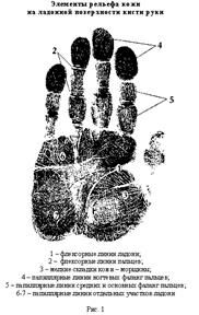Известно, что рельеф кожного покрова неодинаков. На ладонях (ступнях ног) кроме валикообразных выступов, называемых папиллярными линиями и разделенных бороздками, есть флексорные (сгибательные) линии, морщины и складки (белые линии), а также поры. Самые заметные элементы рельефа флексорные линии. Белые линии (морщины) появляются вследствие потери эластичности и сухости кожи, а также возрастных изменений. Эти линии играют при идентификации, как правило, вспомогательную роль. Наиболее значимы папиллярные линии и поры, имеющие различную форму и расположенные на разном расстоянии одна от другой и от краев папиллярных линий. Эти линии на ладонях и ногтевых фалангах пальцев обладают достаточно сложным и разнообразным строением (см. рис. 1).