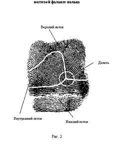 Папиллярные узоры ногтевых фаланг пальцев формируются тремя потоками папилляров: линиями центра, периферическими и базисными. Часть узора, в которой эти потоки соприкасаются, образует характерный участок, называемый дельтой, так как он похож на эту букву греческого алфавита (см. рис. 2).