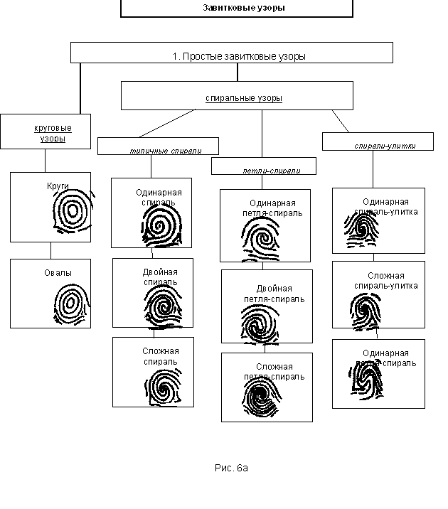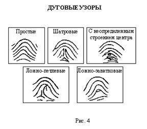 Папиллярные узоры ногтевых фаланг пальцев подразделяются на типы и виды в зависимости от рисунка их центра. По этому основанию различают три типа узоров: дуговые, петлевые и завитковые (см. рис. 3).