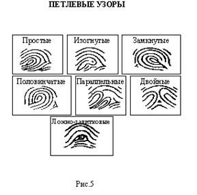 Петлевые узоры различают по направлению ножек петли и строению последней. По направлению ножек петлевые узоры делятся на радиальные (ножки обращены в сторону большого пальца) и ульнарные (ножки петли обращены в сторону мизинца). В зависимости от строения петли узоры бывают простыми, половинчатыми, изогнутыми, замкнутыми и др. (см. рис. 5).