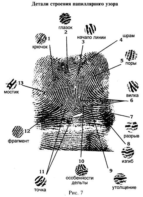Частными признаками папиллярного узора, используемыми для индивидуальной идентификации, служат отдельные особенности в строении каждой конкретной папиллярной линии, ее мелкие морфологические отличия детали. К ним относятся глазки, островки, крючки, мостики, обрывки, раздвоения (вилки), начало линий, шрамы, поры, разрывы, изгибы, утолщения, особенности дельт, точки, слияния папиллярных линий и их фрагменты (см. рис. 7). Для индивидуальной идентификации в сравниваемых следах необходимо выявить неповторимую совокупность совпадающих частных признаков.