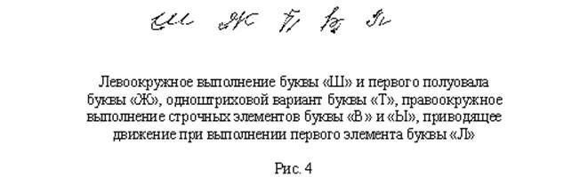 Частные признаки могут иметь место в любых элементах (штрихах) букв: начальных и заключительных, основных и соединительных, овалах и полуовалах, надстрочных и подстрочных (см. рис. 1), выполняемых приводящим или отводящим, левоокружным или правоокружным движением (см. рис. 2), связанных между собой с образованием петли, угловатости, путем примыкания (см. рис. 3).