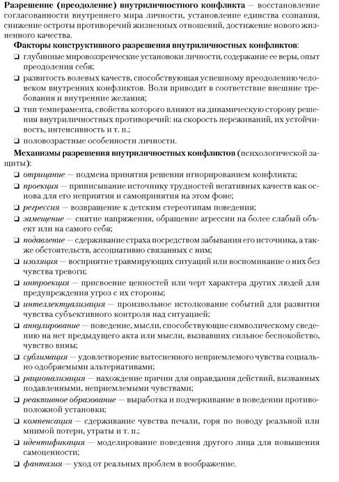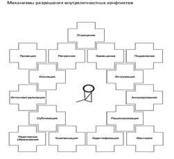 Преодоление внутриличностного конфликта обеспечивается образованием и действием механизмов психологической защиты (3. Фрейд, Ф. Бассин). Психологическая защита - нормальный, повседневно работающий механизм психики. Она является продуктом онтогенетического развития и научения. Развиваясь как средство социально-психологической адаптации, механизмы психологической защиты предназначены для контроля эмоций в тех случаях, когда опыт сигнализирует человеку о негативных последствиях их переживания и выражения.