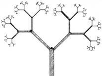 Заметим, что в действительности требуется не так много итераций, чтобы объект воспринимался как фрактальный. Снежинка Кох на нашем рисунке представлена пятью приближениями, у ветвящегося дерева семь развилок, что уже убеждает во фрактальности объекта. Видимо, количество итераций, лежащее между психологическими константами три и семь, уже вполне задает восприятие структуры объекта как фрактальной.