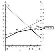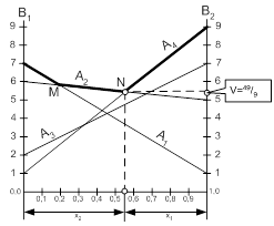 Чтобы определить наилучший результат из наихудших, построена нижняя огибающая прямых В1В1, В2В2 и В3В3 (изображенная на рисунке толстыми линейными сегментами), которая представляет минимальный (наихудший) выигрыш для игрока А независимо от того, что делает игрок В. Наибольшая ордината, равная цене игры n соответствует точке N, в которой пересекаются прямые В2В2 и В3В3. Эта означает, что оптимальная стратегия игрока В включает чистые стратегии В2 и В3. Координаты точки N находим как координаты пересечения прямых В2В2 и В3В3. Вспомним, что уравнение прямой, проходящей через две точки имеет следующий вид: