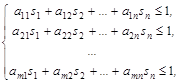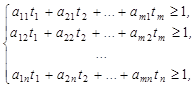 Таким образом, получена задача линейного программирования: найти минимум целевой функции при заданных ограничениях, причем на переменные наложено условие неотрицательности. Решая ее, находим значения ti, i = 1, 2, …,m и величину 1/v, затем отыскиваются значения xi = vti.