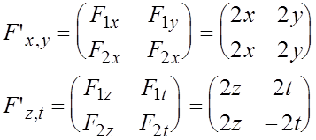 В заключение рассмотрим простой пример «двумерной» неявной функции двух переменных, определяемой системой двух нелинейных уравнений с четырьмя «неизвестными»: