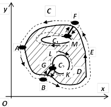 Случай замкнутой кривой. В этом случае в качестве начальной и конечной точки можно взять произвольную точку кривой. Замкнутую кривую в дальнейшем будем называть контуром и обозначать буквой С. То, что кривая, по которой вычисляется интеграл, замкнута, принято обозначать кружочком на знаке интеграла: