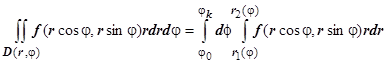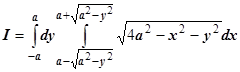 Здесь область D ограничена окружностью радиуса а, сдвинутой на а единиц по оси Ох. Уравнения для правой, левой, верхней и нижней полуокружностей приведены на рисунке. Повторные интегралы в декартовых координатах
