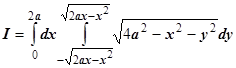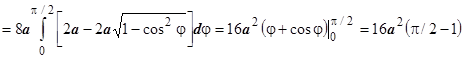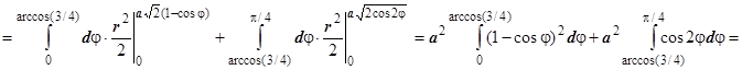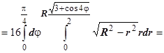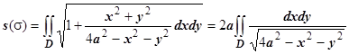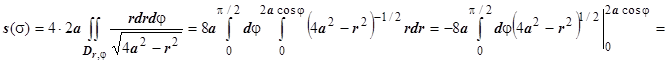 . Область D - сдвинутый на а единиц по оси Ох круг, поэтому вычисляем в полярных координатах, учитывая симметрию поверхности относительно плоскостей Оху и Охz: