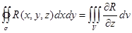 2) Для доказательства выбранной части формулы представим пространственную область V в виде объединения конечного числа цилиндрических тел, не имеющих общих внутренних точек, с образующими, параллельными оси OZ. Доказательство можно проводить для цилиндрического тела. В самом деле, тройной интеграл в правой части равен сумме тройных интегралов по цилиндрическим телам (свойство аддитивности). Поверхностный интеграл в левой части также равен сумме поверхностных интегралов по полным поверхностям цилиндрических тел, причем при суммировании интегралы по общим границам соседних цилиндрических тел будут сокращаться из-за противоположного направления внешних нормалей на общих границах.