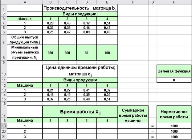 - время работы каждой машины; продукции