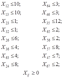 Условие (3.9) отражает величину максимального потока, который равен количеству вещества, вытекающего из источника, или притекающего в сток. Условия (3.10) означают, что поток по каждой дуге должен быть неотрицательным и не превышать ее пропускной способности; из условия (3.11) следует, что количество вещества, притекающего в любую промежуточную вершину, равно количеству вещества, вытекающего из нее.
