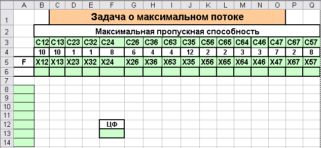Диапазон ячеек A6:Q6 отведем под расчетные значения переменных. В ячейки A8:A14, а также в целевую ячейку F13 введем следующие формулы