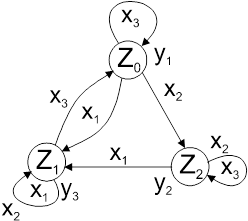 Конечный автомат имеет множество внутренних состояний и входных сигналов, являющихся конечными множествами. Автомат задаётся F- схемой: F=<z,x,y,j,y,z0>, (1)