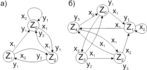Рис. 1. Графы автоматов Мили (а) и Мура (б).