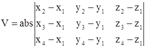 10. Объем параллелепипеда с вершинами A(x1,y1,z1), B(x2,y2,z2), C(x3,y3,z3), D(x4,y4,z4) и ребрами AB, AC, AD
