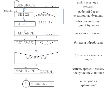 В поле А каждого блока MATCH указывается метка сопряженного ему блока. При подходе этого транзакта к этому блоку, проверяется наличие в сопряженном ему блоке транзакта из того же ансамбля. Если в обоих блоках имеются транзакты одного ансамбля, то они одновременно пропускаются через блоки MATCH. Иначе поступающий транзакт будет ожидать постуления транзакта того же ансамбля в сопряженный блок MATCH. После чего они оба будут пропущены в следующие за блоками MATCH блоки.