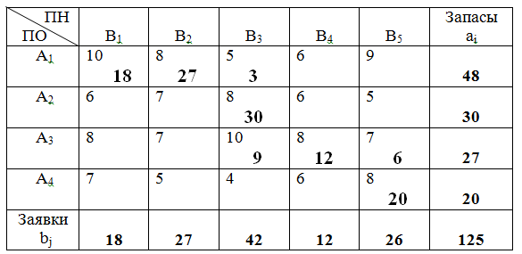 Применённый выше метод отыскания оптимального решения транспортной задачи называется распределённым; он состоит в непосредственном отыскании свободных клеток с отрицательной ценой цикла и в перемещении перевозок по этому циклу.