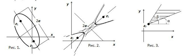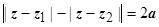 - гипербола с фокусами в точках z1 и z2; расстояние между фокусами 2с=