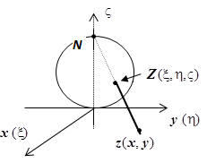 19.1.4. Сфера Римана. Бесконечно удалённая точка. Риман предложил применять для геометрического представления комплексной плоскости сферу. Вместе с координатами х, у в плоскости Z рассмотрим трёхмерную прямоугольную систему координат