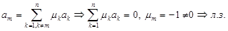 Теорема 1 (необходимое и достаточное условие линейной зависимости). a1,…,an – линейно зависима