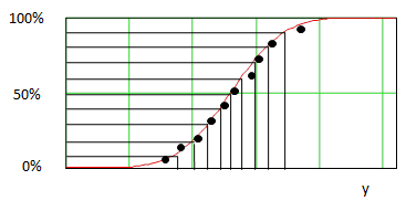 На графике кумулятивных вероятностей нормального распределения шкалу по вертикальной оси корректируют так, чтобы зависимость кумулятивных вероятностей от значений случайной переменной (у) представлялась в виде прямой линии. Для 10 значений случайной выборки наблюдений из популяции, имеющей распределение по нормальному закону, это делается следующим образом [Box с соавт. (2005) стр.33].