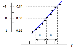 С использованием прямой линии, представляющей график кумулятивных вероятностей нормального распределения, можно приблизительно оценить стандартное отклонение. Если на Рис.1.6.2 значения переменной (у) считывать по горизонтальной оси для вероятностей 0,16, 0,50 и 0,84 по вертикальной оси, то результат оценки стандартного отклонения равен расстоянию по горизонтальной оси между полученными с использованием прямой линии проекциями точек 0,16 и 0,50 на вертикальной оси или между таким же образом полученными проекциями точек 0,50 и 0,84, или половине расстояния между проекциями точек 0,16 и 0,84.
